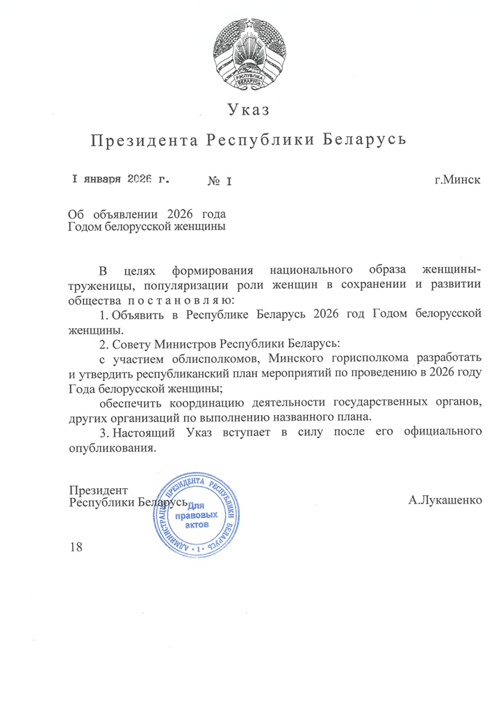 Президент Беларуси Александр Лукашенко подписал указ №1, которым 2026 год объявлен Годом белорусской женщины. Об этом БЕЛТА сообщили в пресс-службе белорусского лидера.