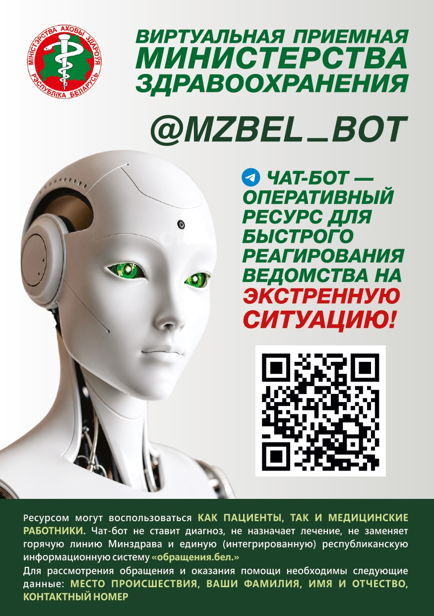 Обращаем Ваше внимание на то, что в целях повышения качества работы виртуальной приемной Министерства здравоохранения (чат-бот Минздрава) с 1 июня 2026 г. данный ресурс будет размещен по новому адресу: @mzbel_bot (https://t.me/mzbel_bot). 🔄